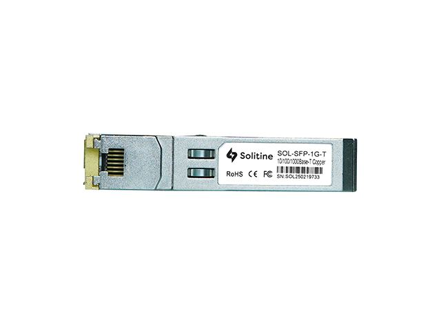 The Solitine 10/100/1000BASE-T Copper SFP Module delivers reliable Ethernet connectivity over standard copper cabling with speeds up to 1Gbps. Supporting auto-negotiation for 10/100/1000 Mbps, it offers a transmission distance of up to 100 meters using Cat5e or Cat6 cables. Featuring a standard RJ45 interface, this SFP integrates seamlessly with switches, routers, and media converters. Its plug-and-play design ensures quick deployment without additional configuration, while compliance with IEEE 802.3u and 802.3ab standards guarantees broad compatibility. Compact and robust, it is ideal for enterprise, ISP, and industrial network applications.