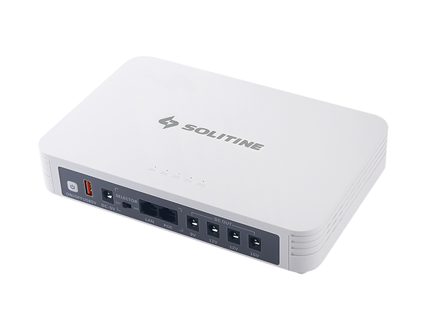 Solitine SOL-700 BS Premium Mini DC UPS is a compact and reliable power backup solution featuring a built-in lithium battery and intelligent microprocessor control. It supports auto start when plugged in, offers protection against overload, short circuits, overcharging, and over-discharging. With selectable DC output voltages (9V/12V/15V/24V) and USB 5V output, it is ideal for routers, modems, CCTV, and other small DC devices.
